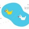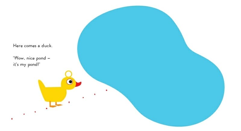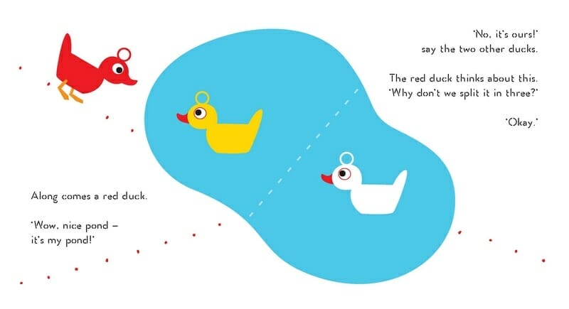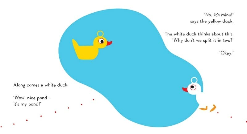 A little yellow duck finds a beautiful pond and claims it for himself. Then he is joined by a white duck, so they split it in two. When a red duck comes along, they split it in three – and so on until the pond has been divided into tiny spaces, all filled with ducks sitting still. When a black duck comes along, he suggests they all share the pond and have fun instead, which is great… Until a hippo shows up!