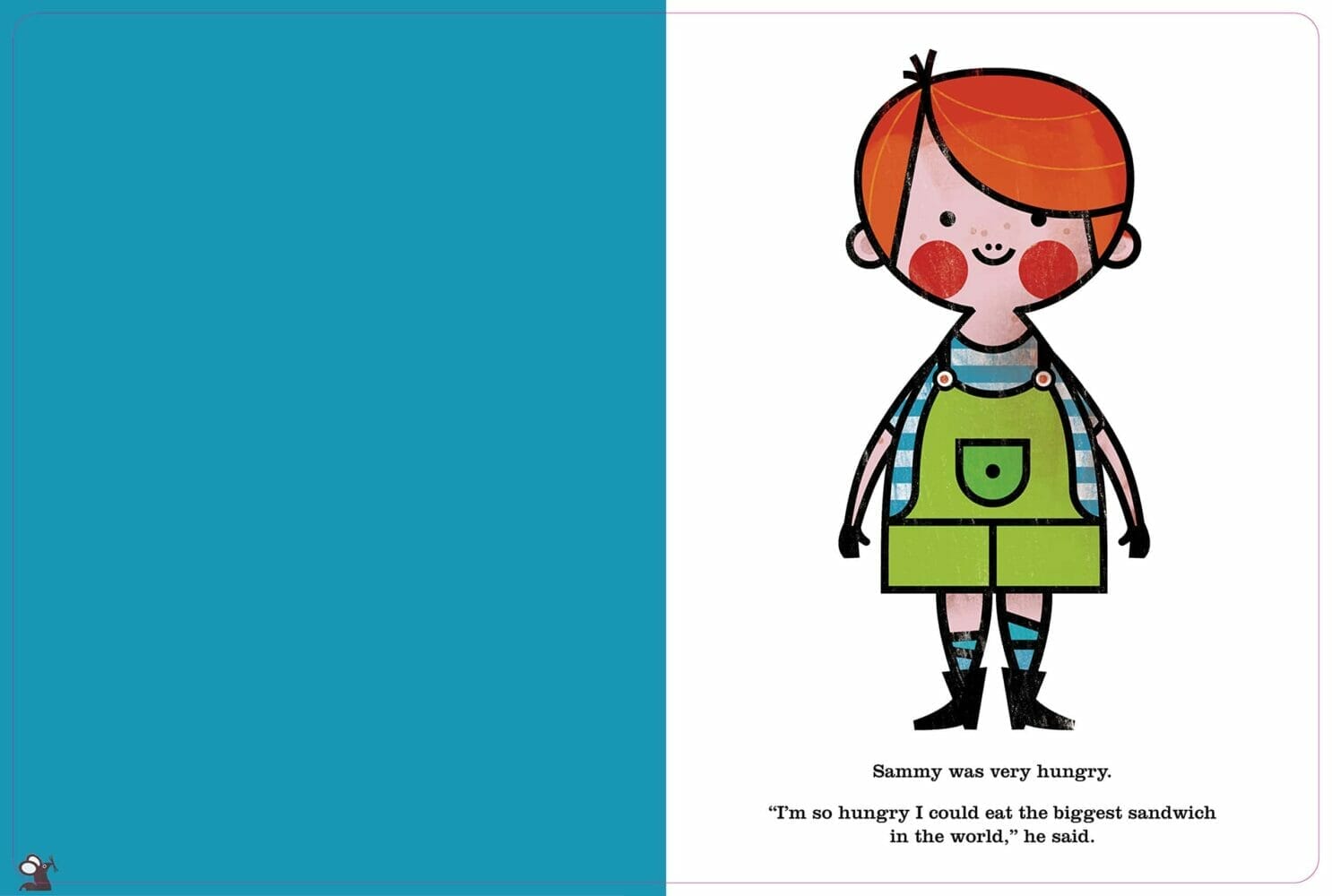 Sammy is a little boy with a huge appetite. The enterprising toddler feels like eating the biggest, tallest sandwich in the world, so he pulls out all the stops. The sandwich soon grows taller than he is, but fortunately there’s a ladder. Sammy saws holes through the ceilings and carries on stacking his sandwich. He can make it even higher by going through the skylight, and with the help of a crane he’s able to top off this creation with an olive and a sprig of parsley. And then … Sammy feels like having a banana.