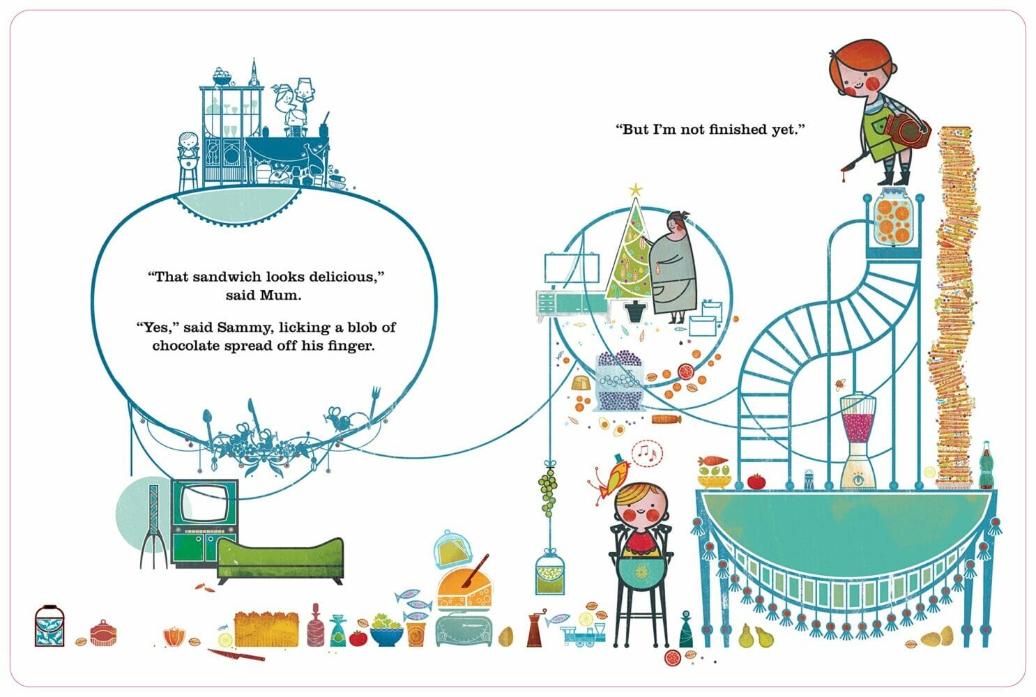 Sammy and the Skyscraper Sandwich is an ode to the creative fantasy of toddlers, who love to convert features of their surroundings into something quite different for a while. This is a look-and-find book full of visual discoveries that will endlessly excite the smallest of children, and indeed their parents.